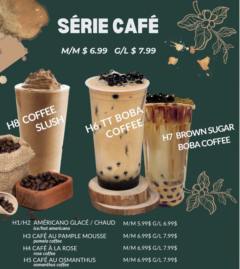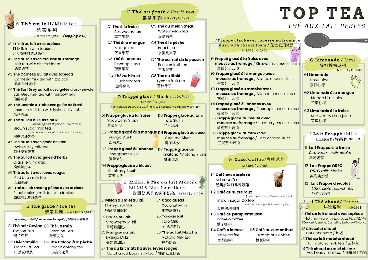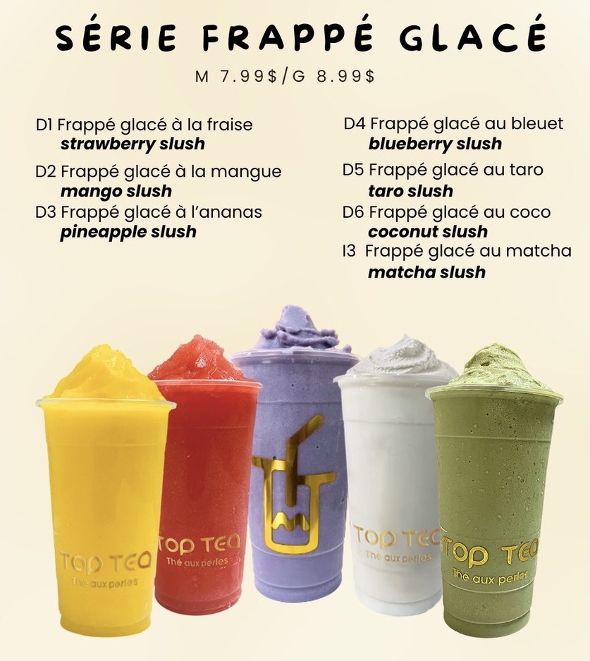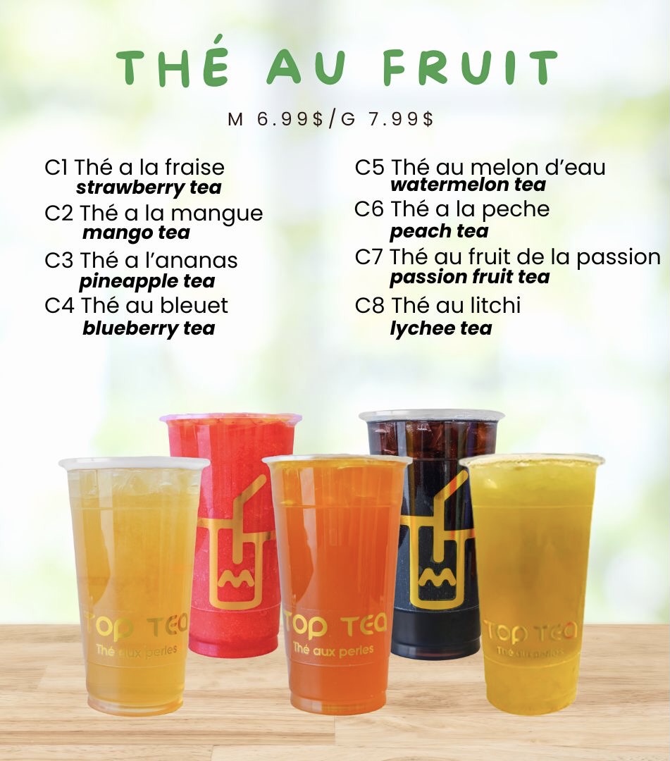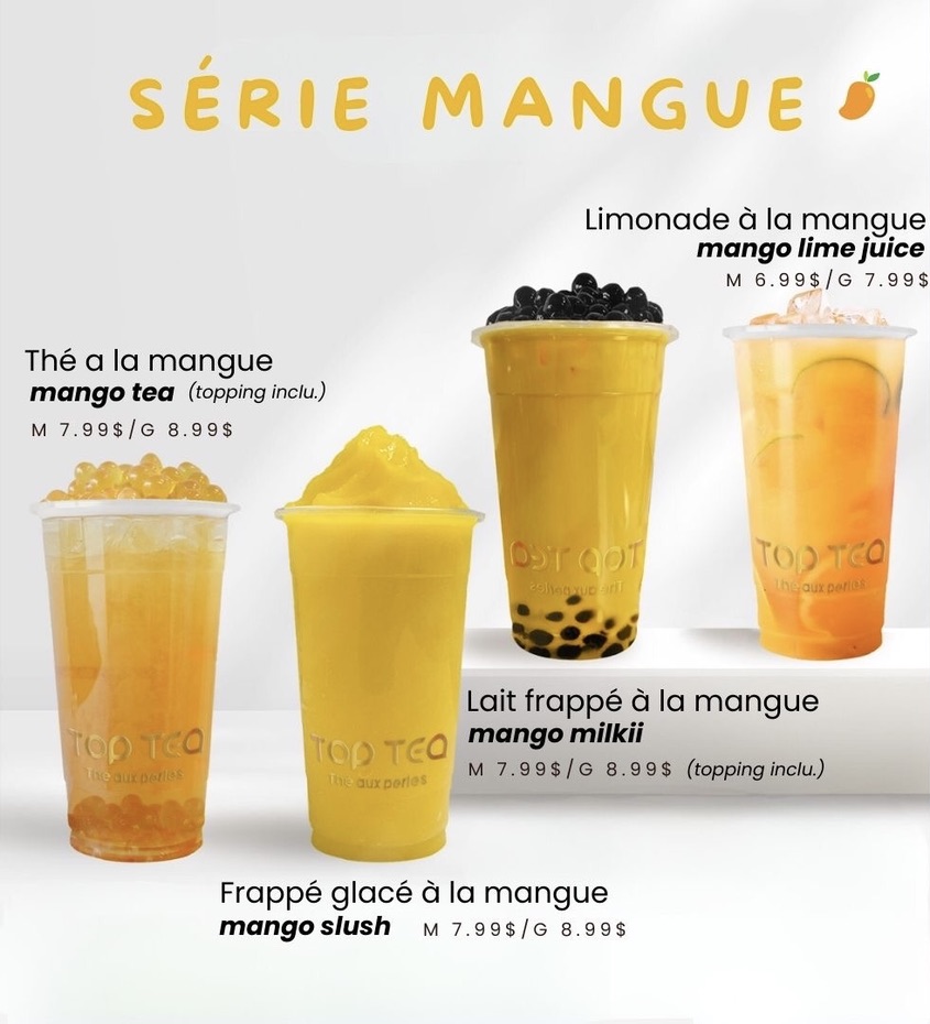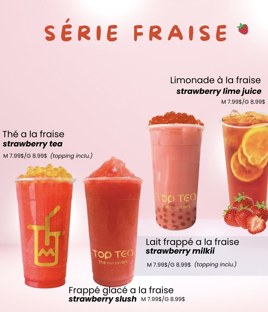 The menu at Top Tea offers a variety of bubble tea beverages and related refreshment options, structured into distinct series and favorites. Customers can choose from fruit-flavored teas and lemonades, such as the Série Fraise featuring strawberry-based drinks and the Série Mangue with mango-themed options. Each series includes items like flavored teas, lemonades, milk frappés, and slushes.